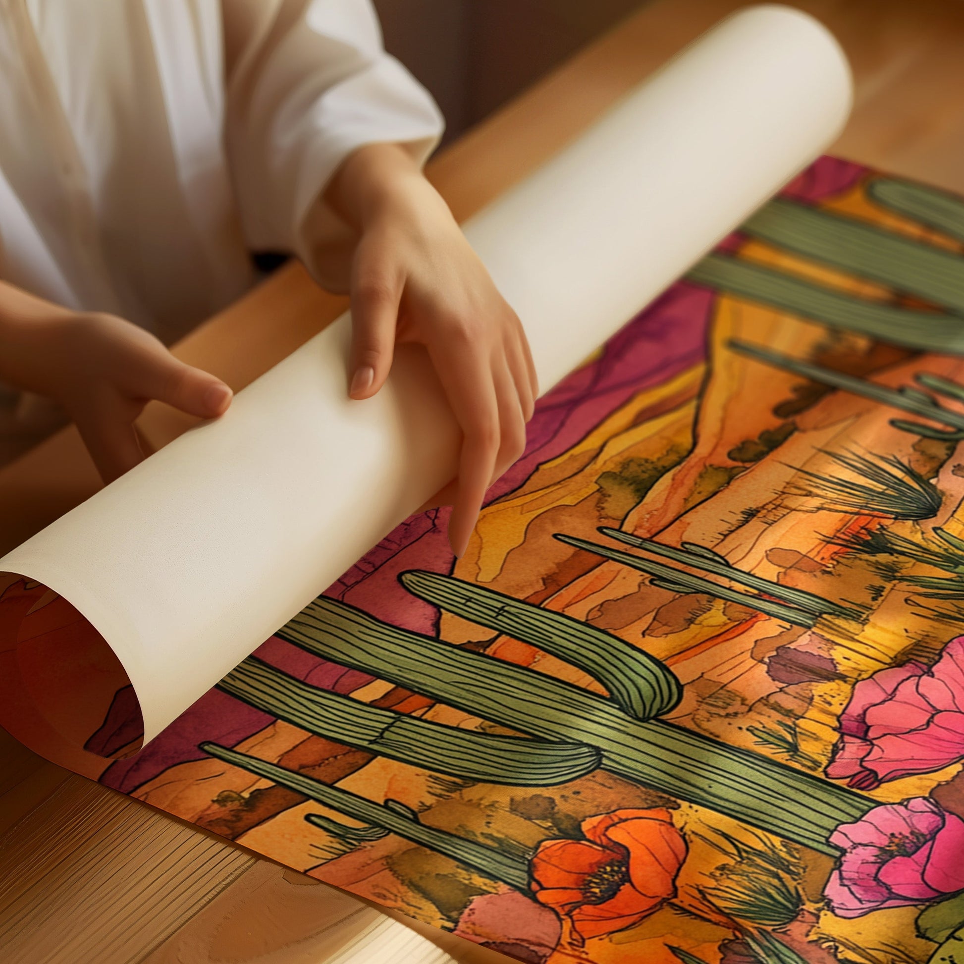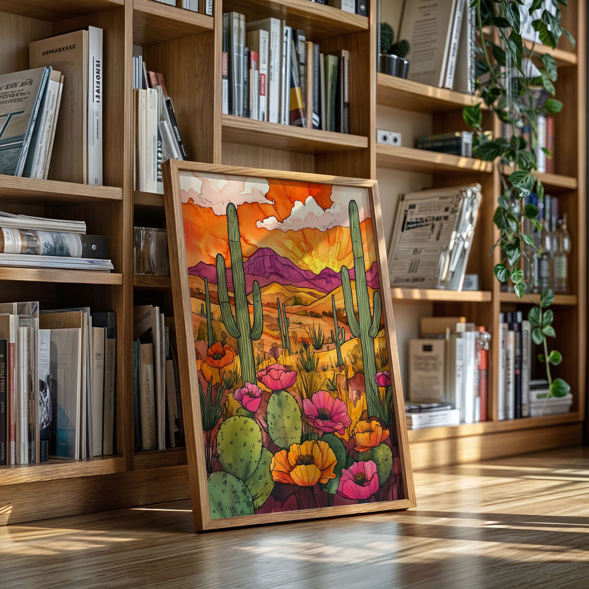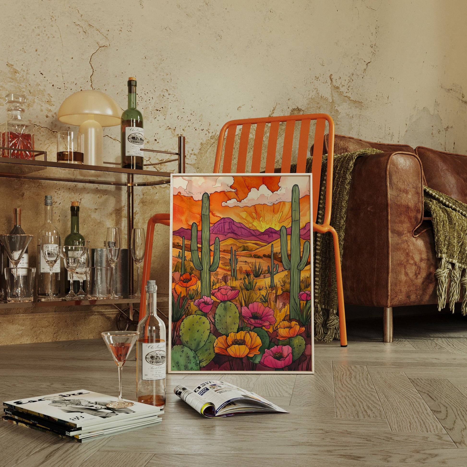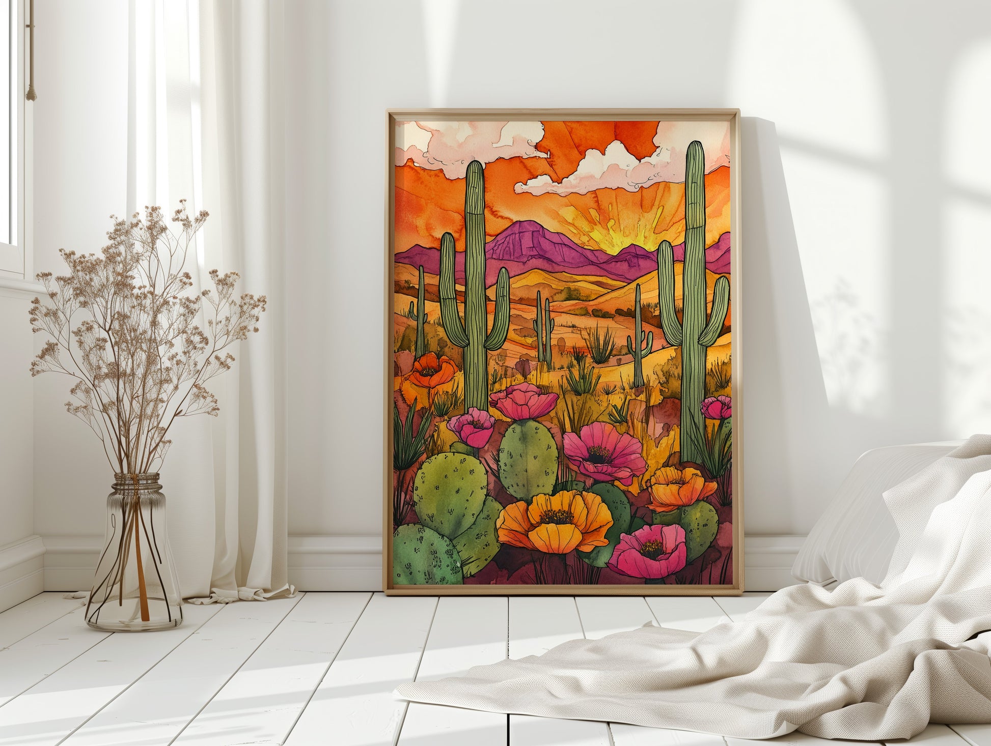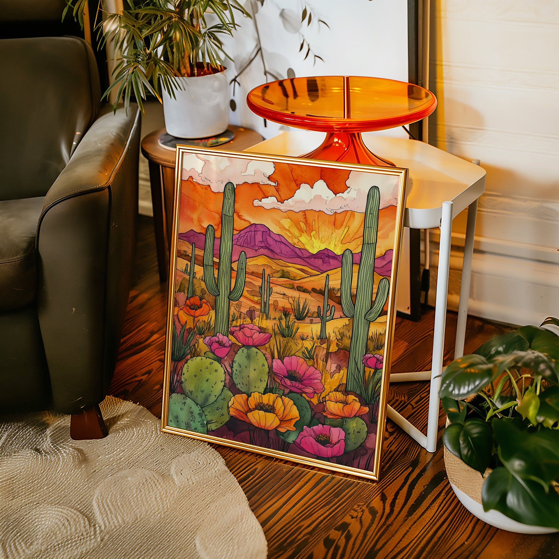 A vibrant sunset casts a warm glow over a desert landscape, where cacti and wildflowers thrive in vivid colors. Part of our Eclectic Bohemian collection, this piece captures the spirit of untamed beauty and adventure. Perfect for brightening up living rooms, study areas, or creative spaces. Each artwork is crafted with meticulous attention to detail, bringing the desert's allure into your home. SKU: AL0778