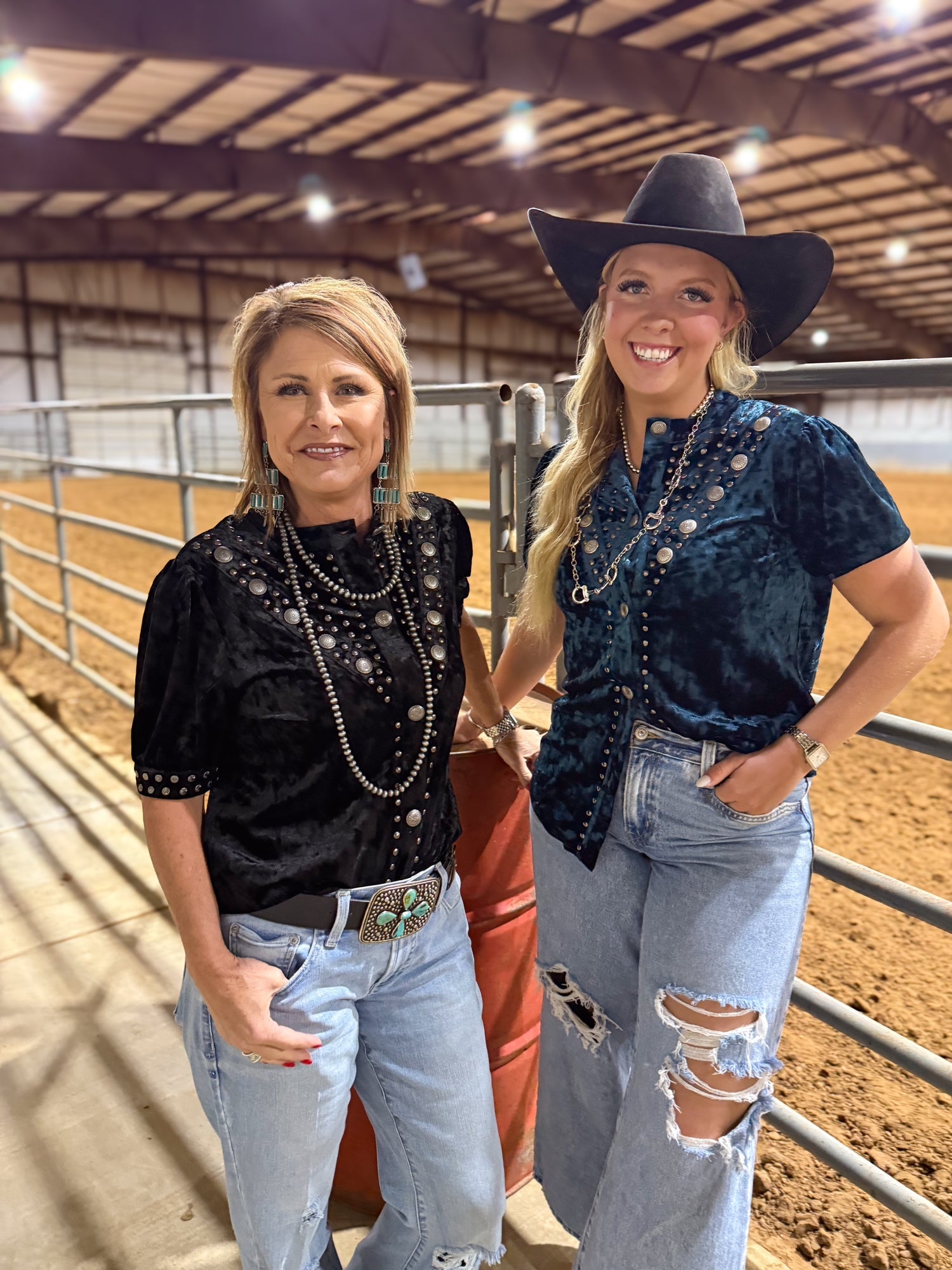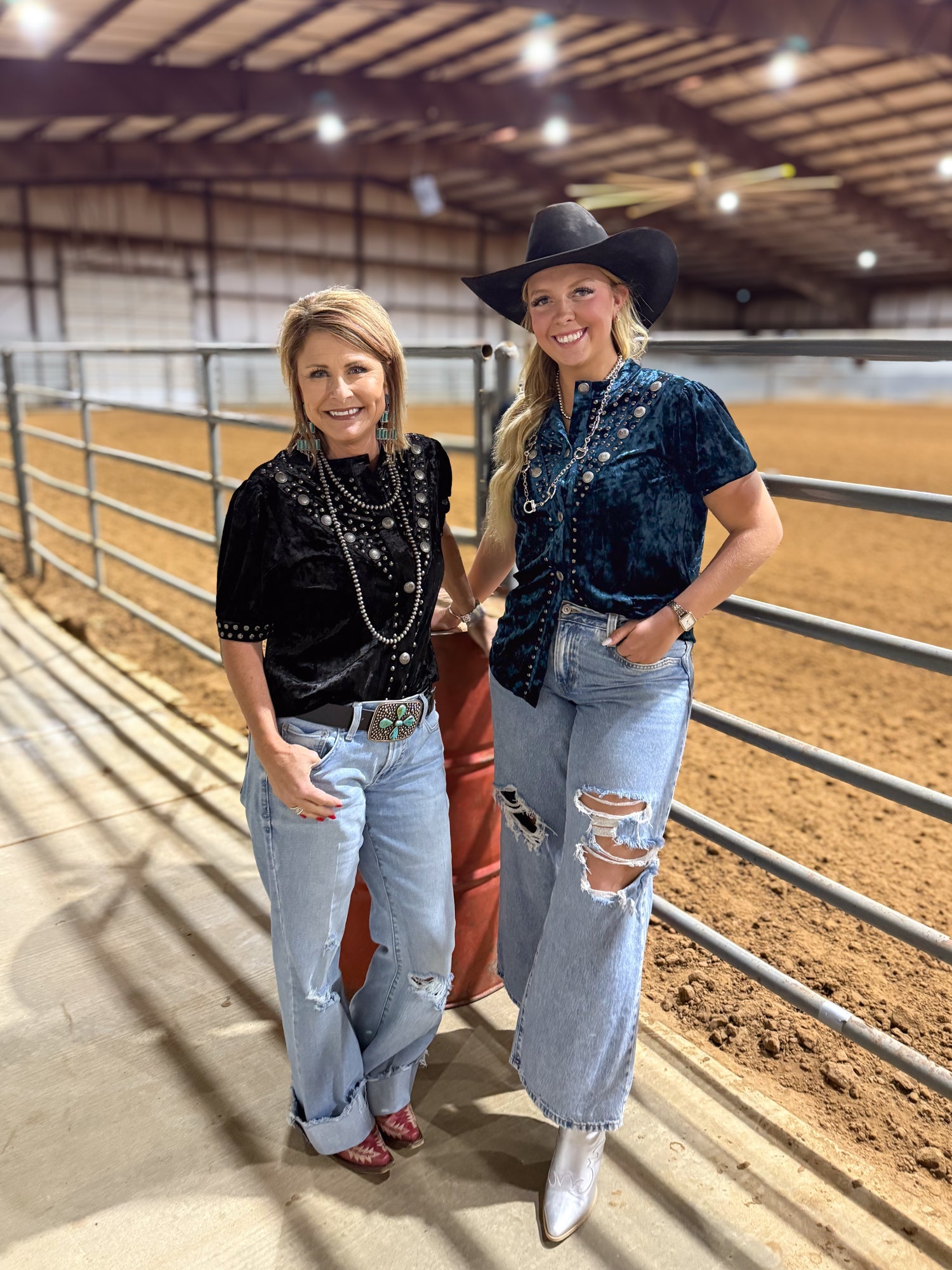 The Vallejo Velvet Button Up brings all the drama in the most western way. Crafted from ultra-soft crushed velvet, this top shines with studded detailing, concho-inspired buttons, and a silhouette that’s equal parts classy and cowgirl. Whether you choose the bold Black or the rich Teal, each one catches the light and adds instant texture to your outfit.