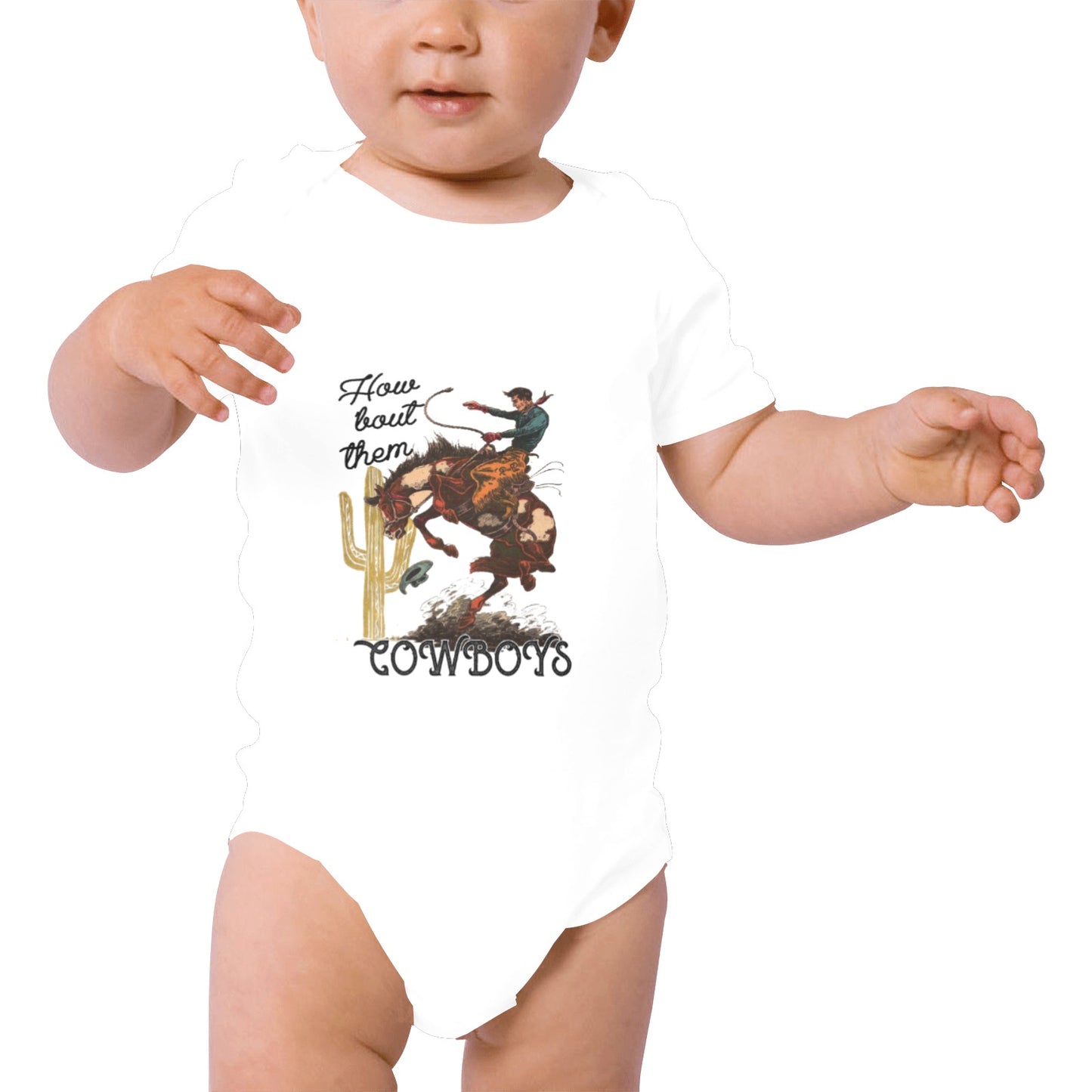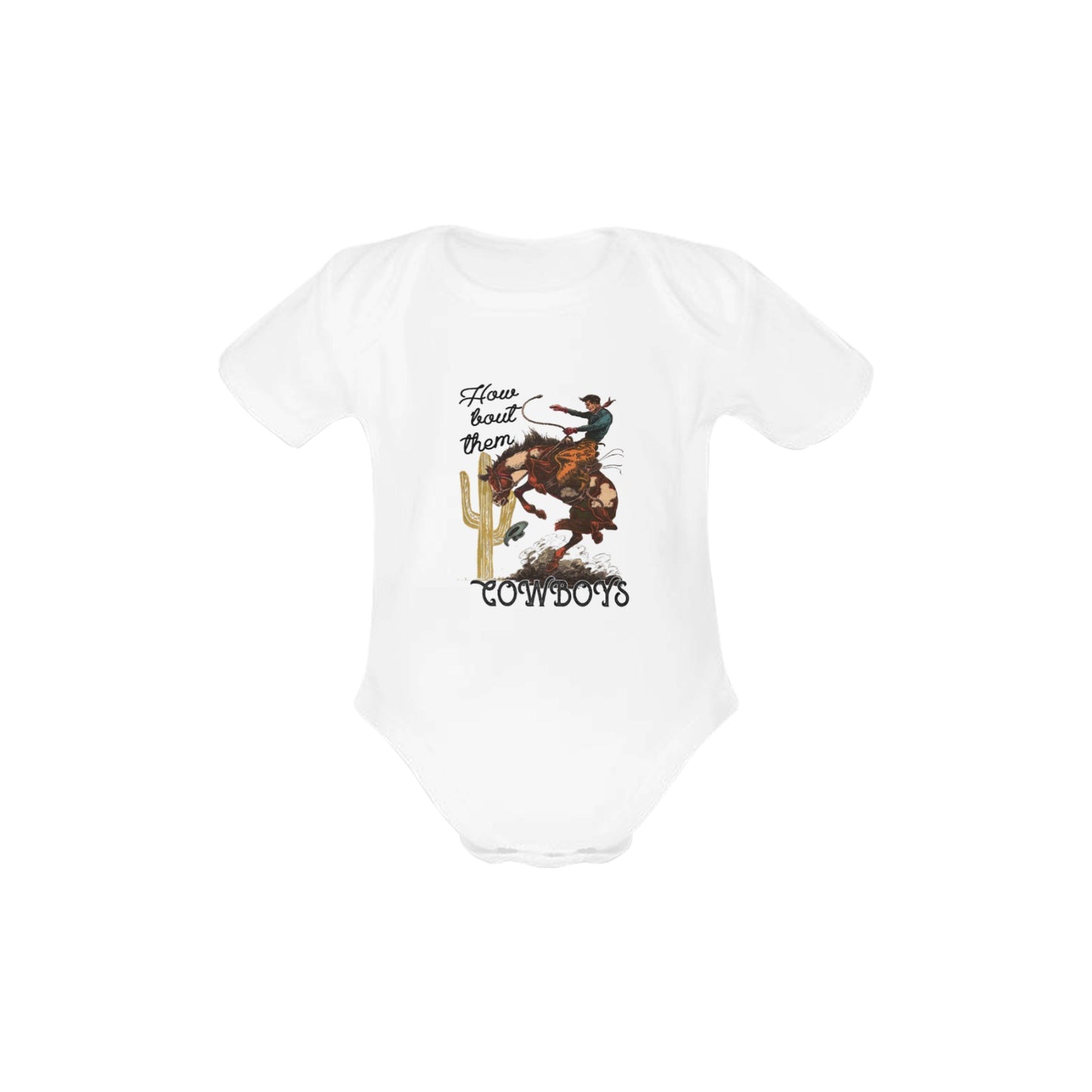 Welcome your littlest one to the world with this How bout them cowboys Little Bitty Organic Baby Onesie! So fun and organic, this baby bodysuit is all-natural and comes with a cute message on the back, guaranteed to make you smile. Put this one on for a memorable, extra-adorable debut. Yee-haw!