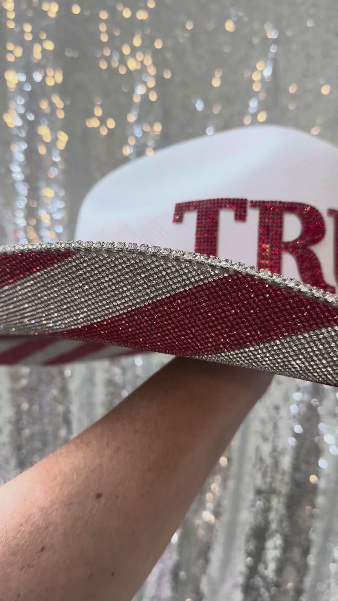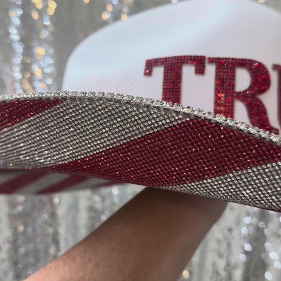 - TRUMP in red rhinestone letters on the front of the hat
