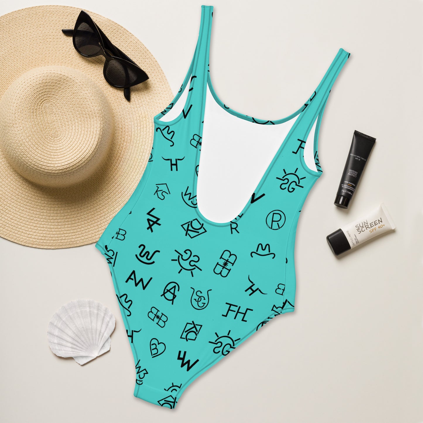 Yeehaw Turquoise Cattle Brands One-Piece Swimsuit