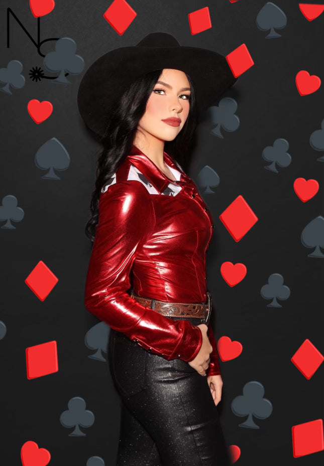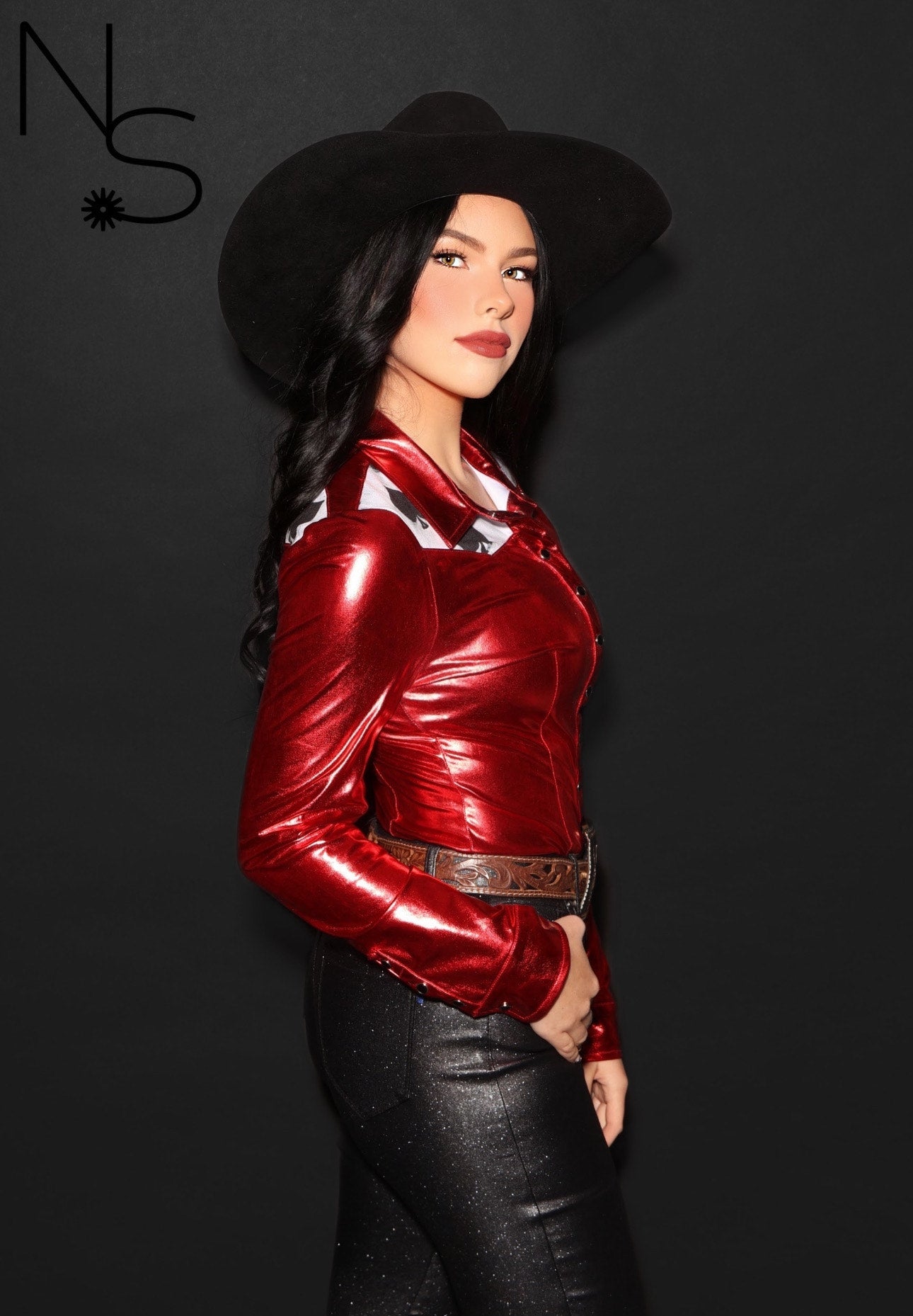Tailored with a slim, contoured fit, this shirt feels like it was made just for you – hugging you in all the right places while letting you move like the queen of the arena. Handmade in small batches, this limited-edition piece is as rare as a wild mustang and just as untamed. Under the bright lights, the Vegas Heat shines like a ruby in a silver mine, making sure all eyes are on you when you hit the scene.