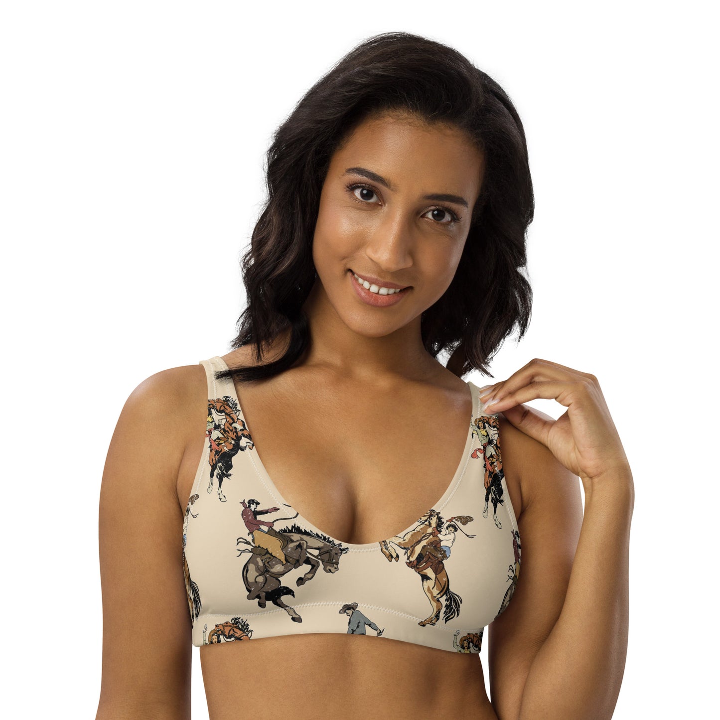 Spice up your beach wardrobe with this Yeehaw Vintage Cowgirl Bikini Top! Featuring a vintage cowgirl bronc rider pattern, this top is perfect for a summer of rockin’ pool parties and days by the sea. So yeehaw, ladies - saddle up and let the sunshine in!