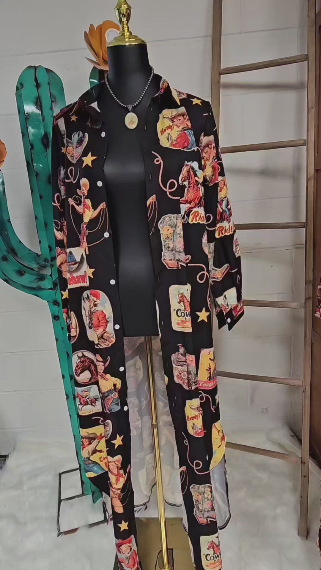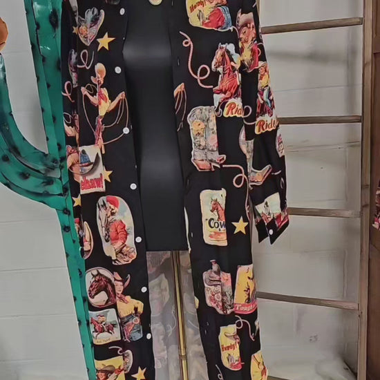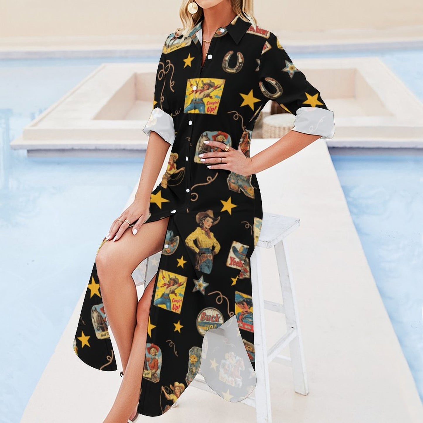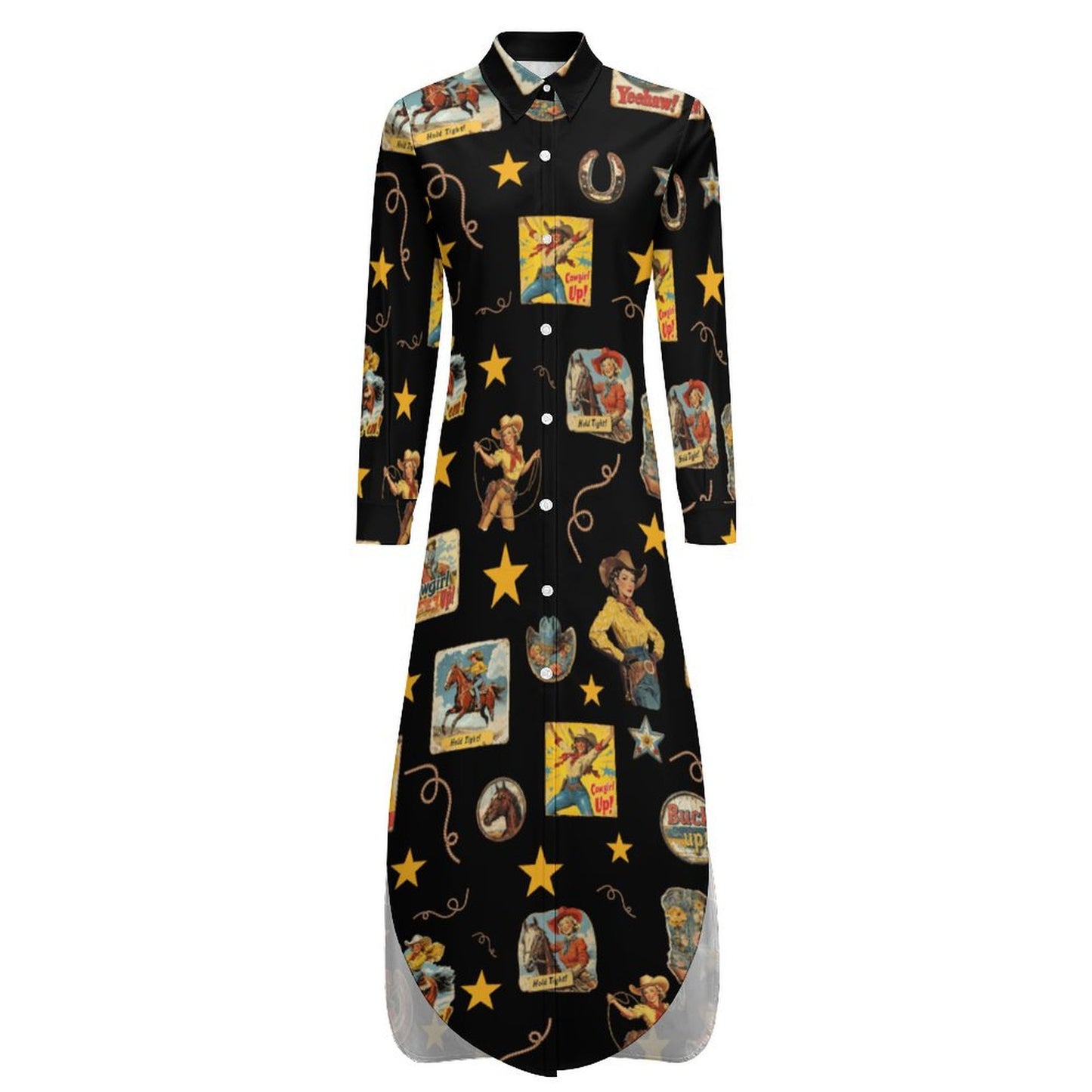 Vintage Cowgirl Collage Western Button-Up Long Sleeve Shirt Dress Duster