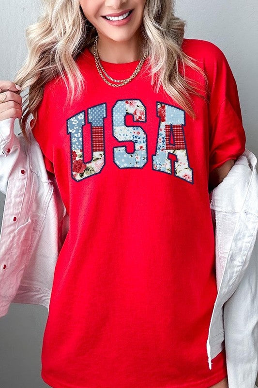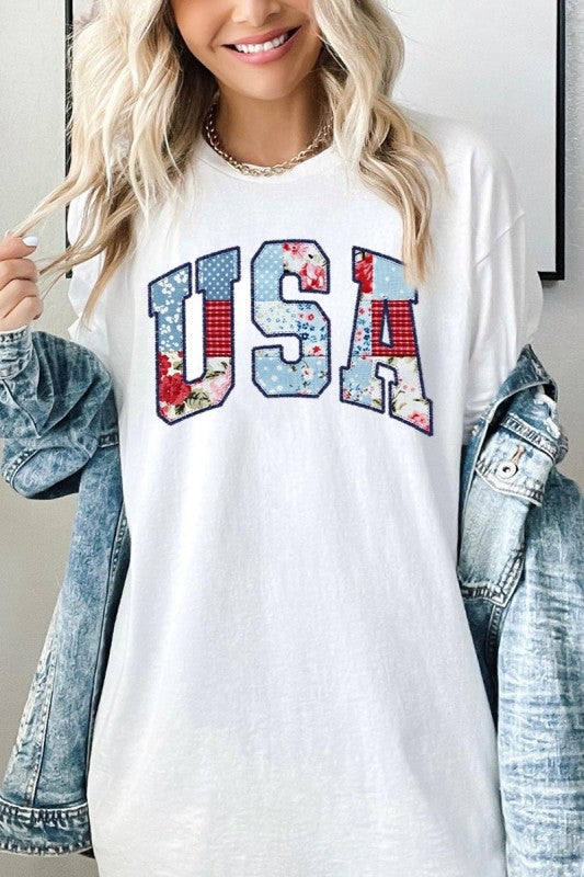 Faux patch shirt, USA, patriotic shirt, 4th of July shirt, vintage USA tee, America shirt, patchwork USA graphic, printed patchwork design, Independence Day, floral patriotic shirt Graphic Heavy Cotton Tee.