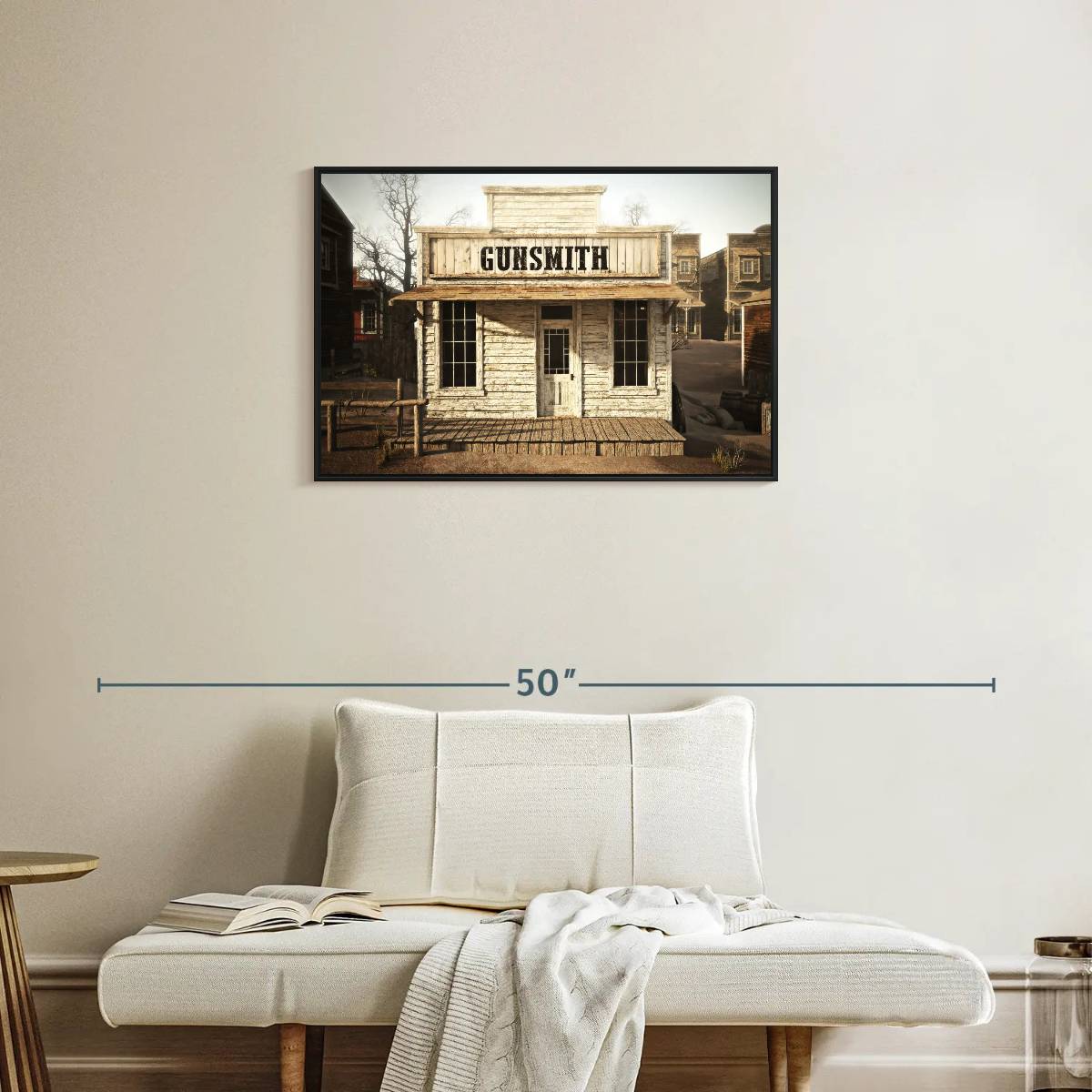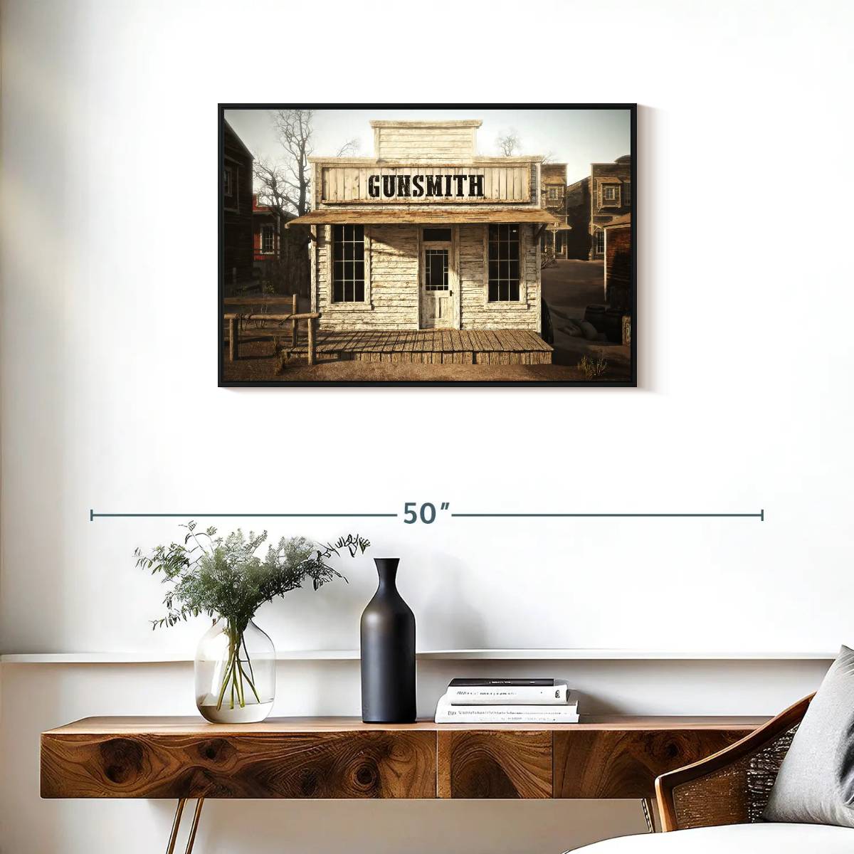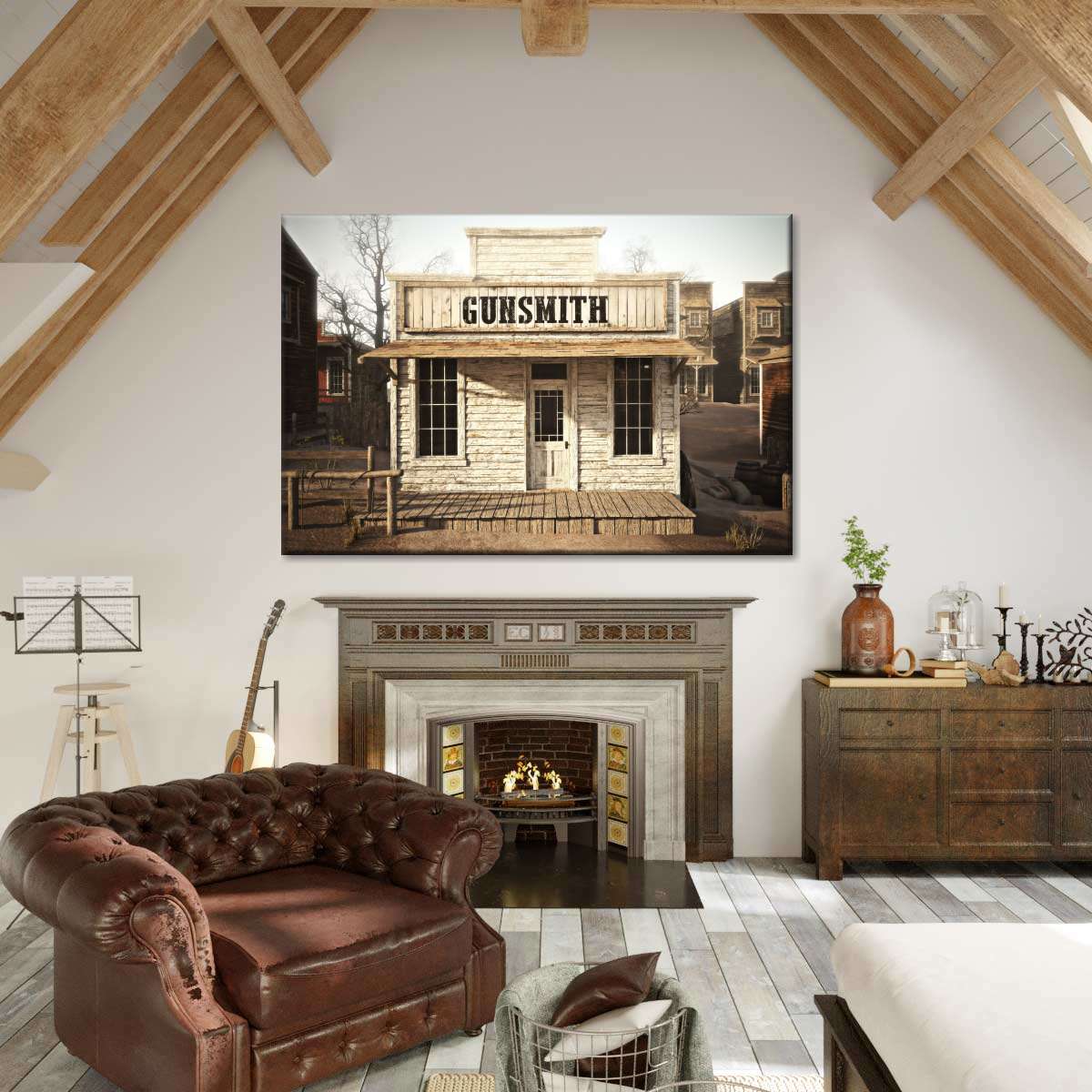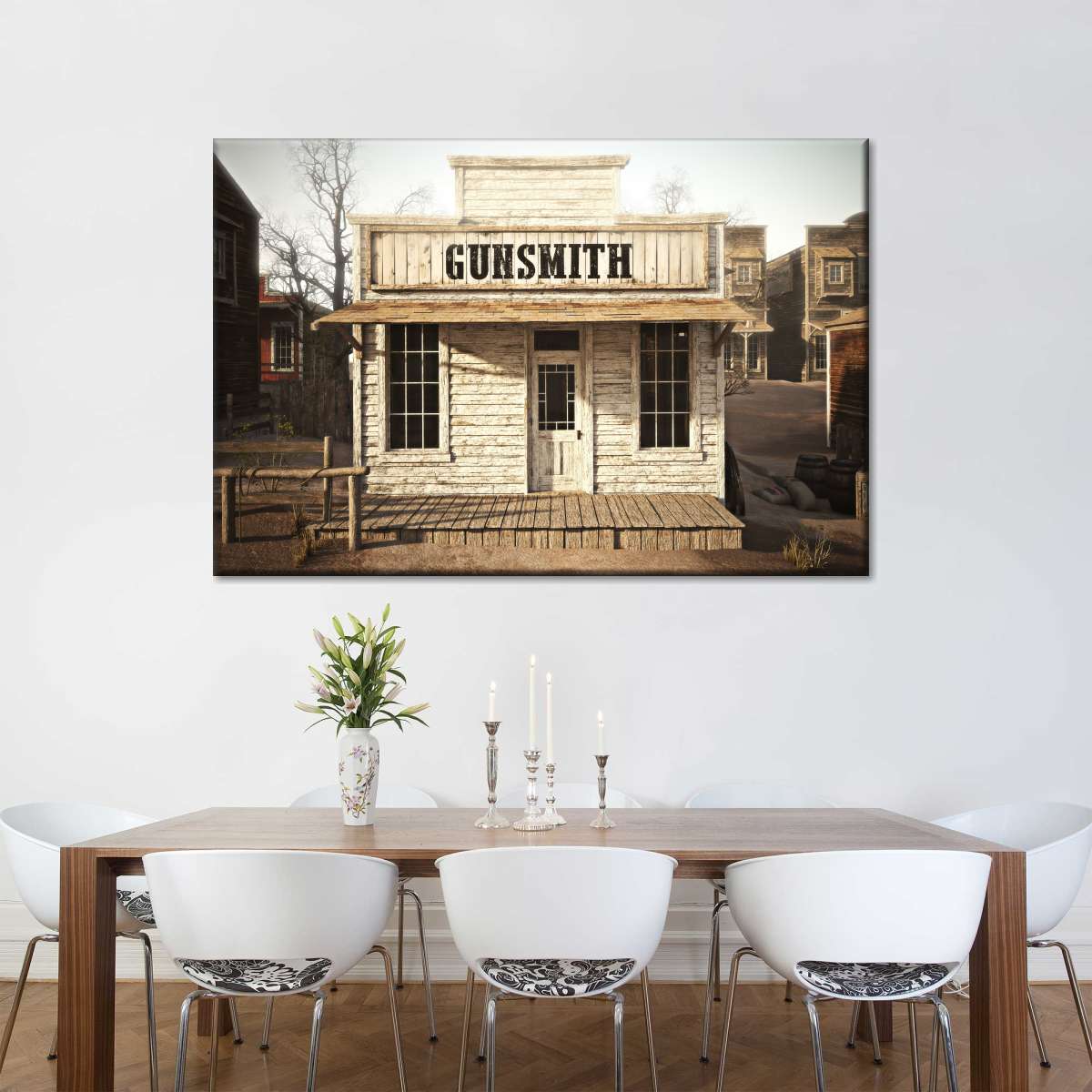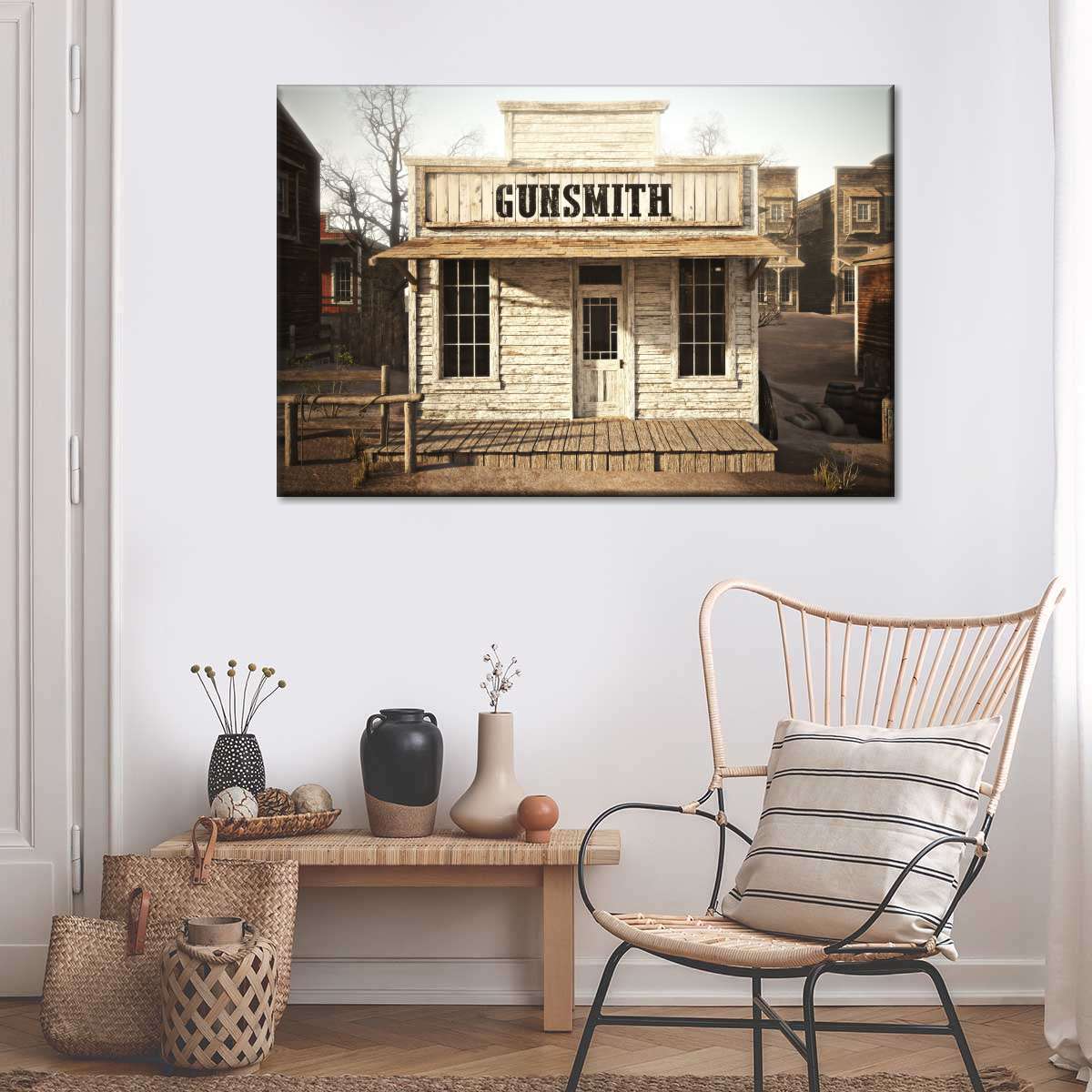 Western Gunsmith Shop Wall Art adds a western touch of old west authenticity to your walls. This Western canvas print is sure to add character to your space and complement any farmhouse style decor.