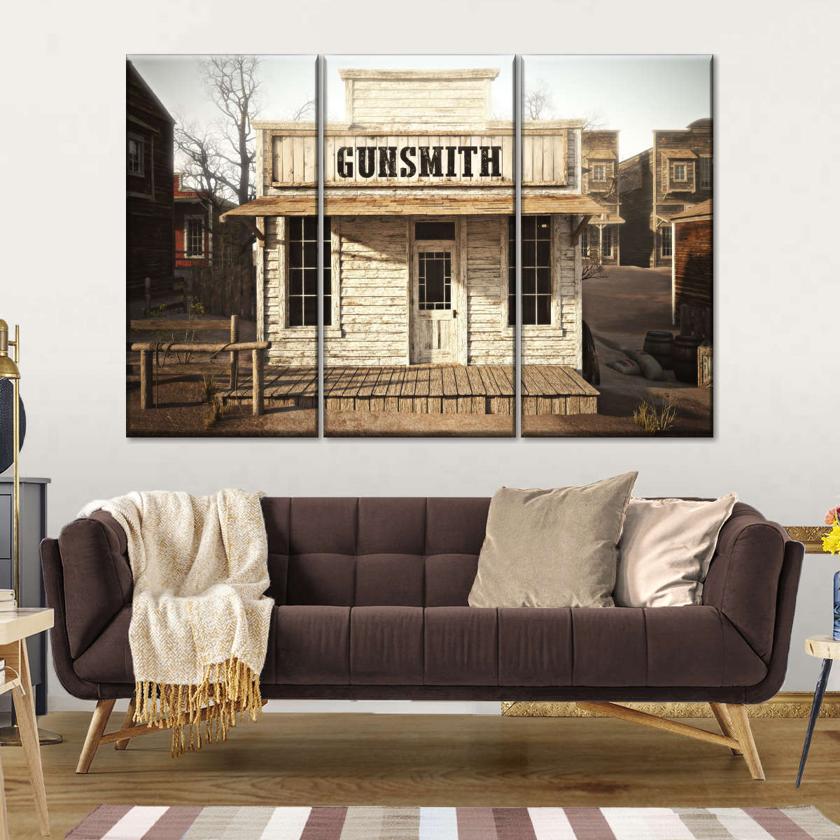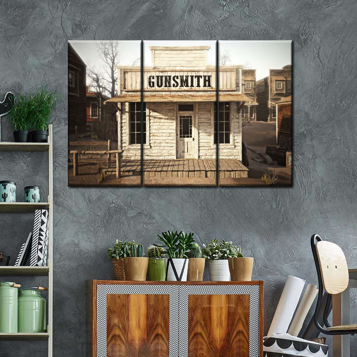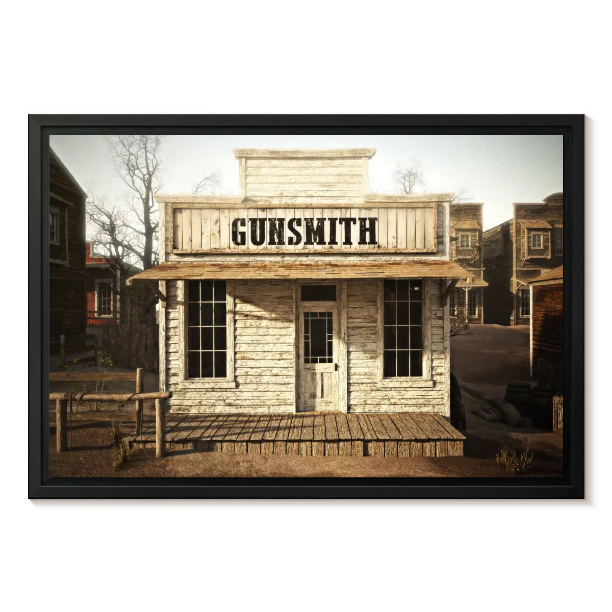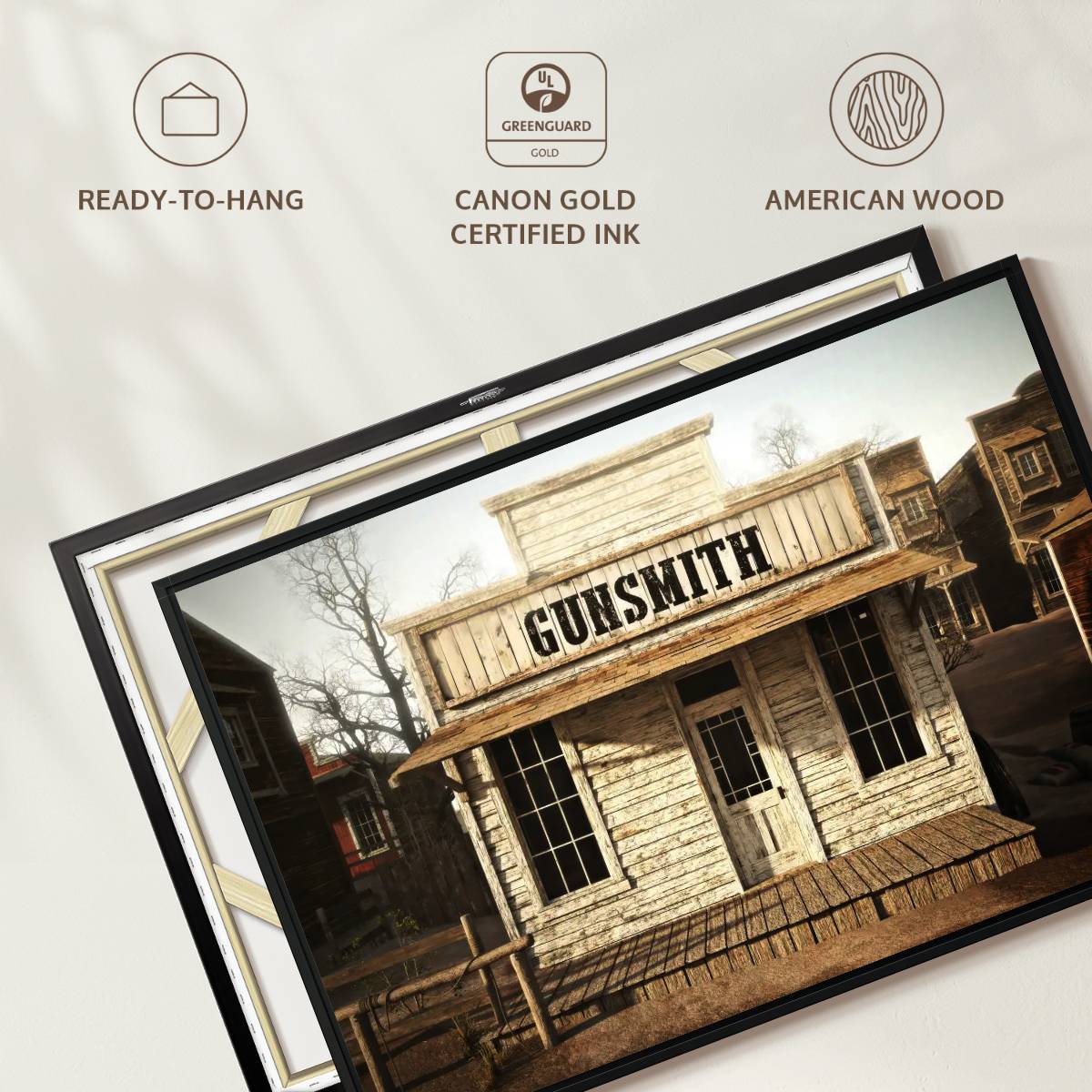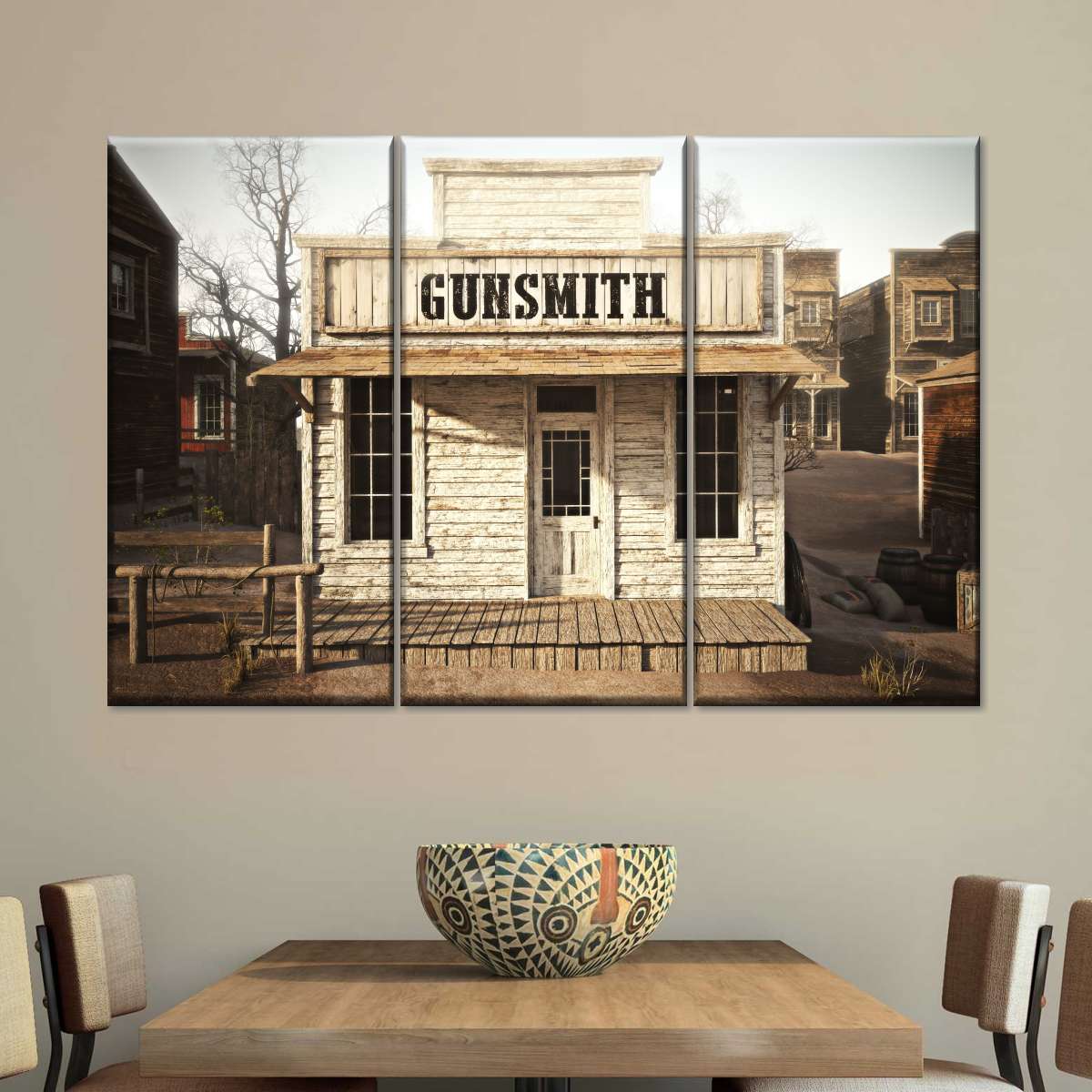 Western Gunsmith Shop Wall Art adds a western touch of old west authenticity to your walls. This Western canvas print is sure to add character to your space and complement any farmhouse style decor.
