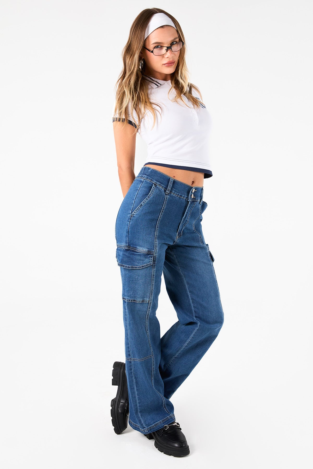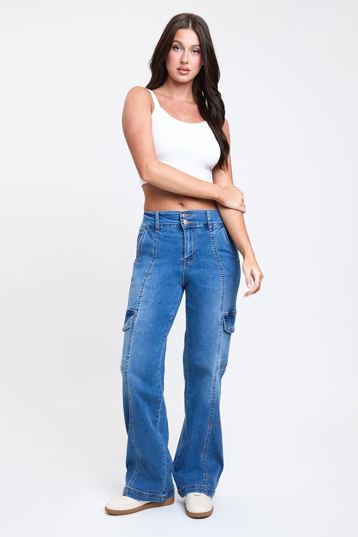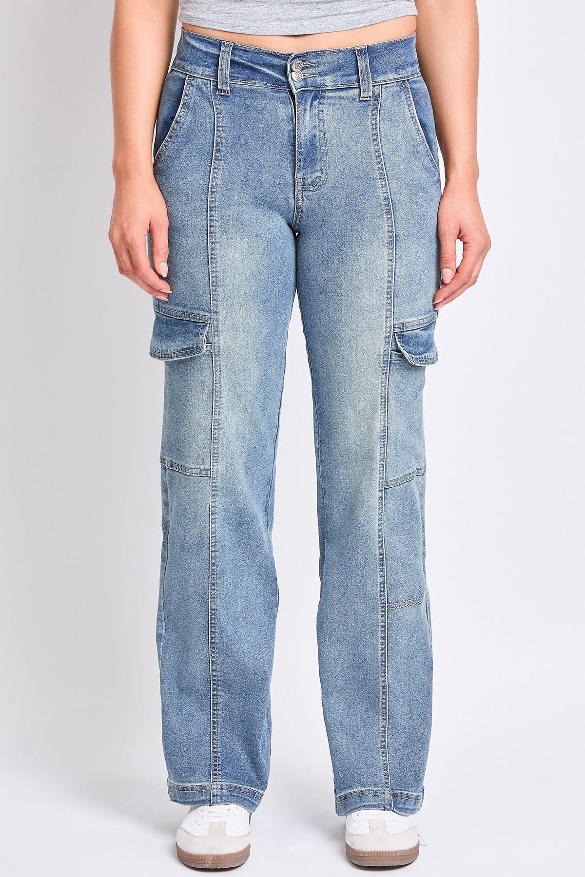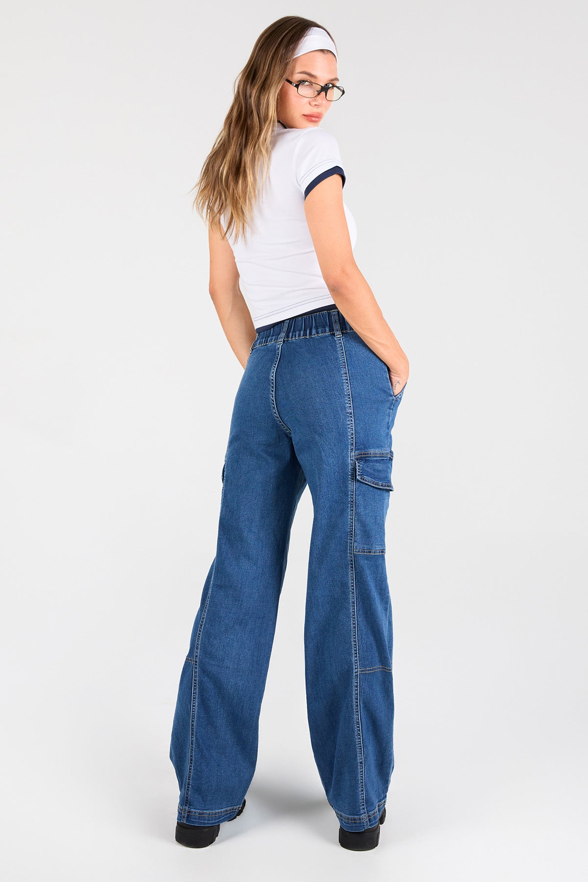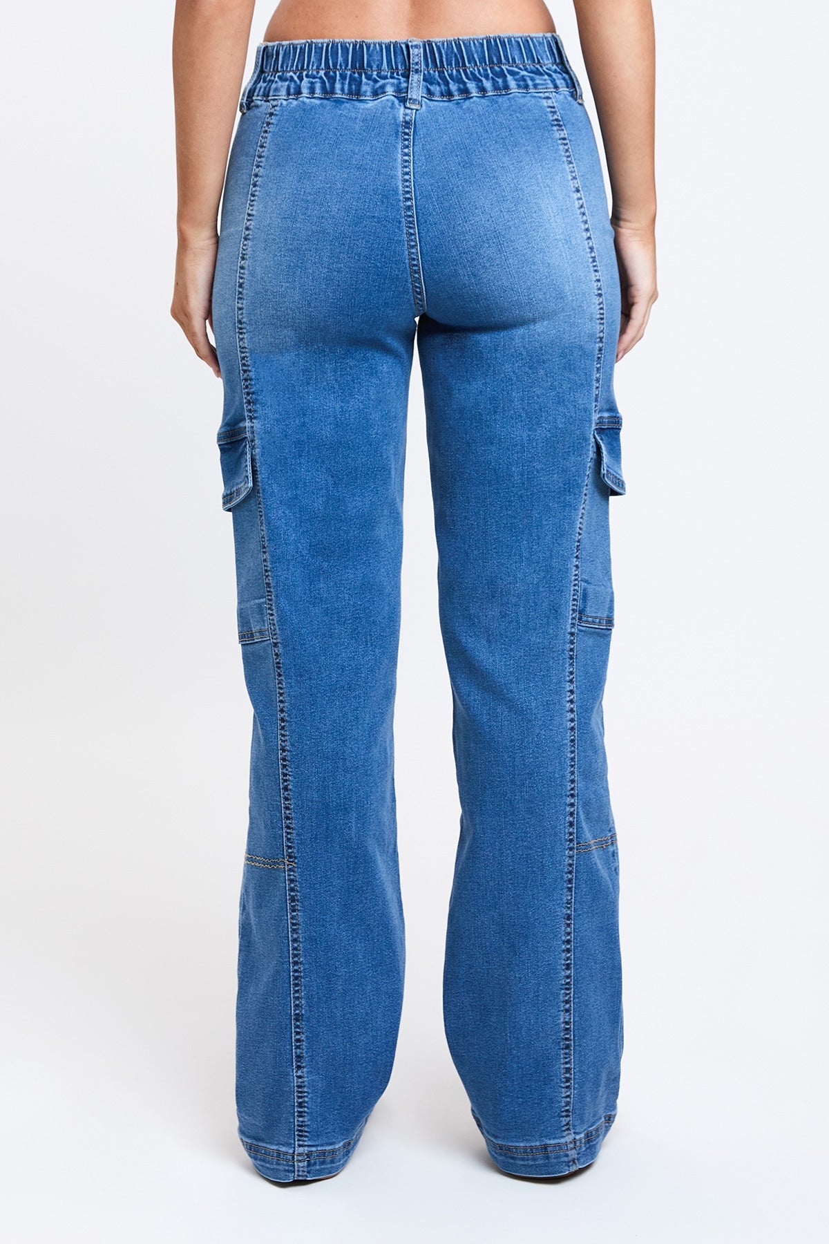 We’re spending every day in our Women’s High Rise Straight Leg Cargo Jeans. Constructed with comfy stretch denim and an elastic waistband, this trendy high-waisted jean will be your new favorite too. Detailed with front seams to draw the eye and elongate your legs, rectangular patch pockets, and flap cargo pockets at the side. We omitted back pockets and added a vertical seam for a look that compliments your bum. Style with a crop top and tennis shoes for a street-smart sporty vibe that’s sure to rake in compliments!